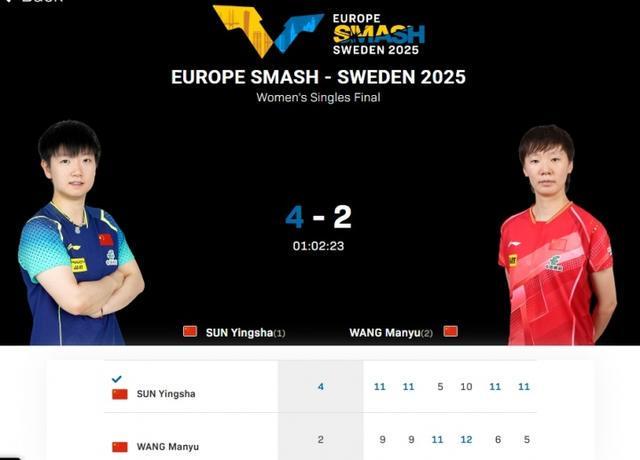 直播吧08月24日讯 WTT瑞典大满贯女子单打决赛,世界排名第1的孙颖莎对阵世界排名第2的王曼昱。最终孙颖莎4-2击败队友王曼昱,夺得冠军!