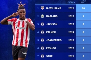 开云体育app-目前足坛最长合同榜:尼科-威廉姆斯10年居首,前10切尔西占7席